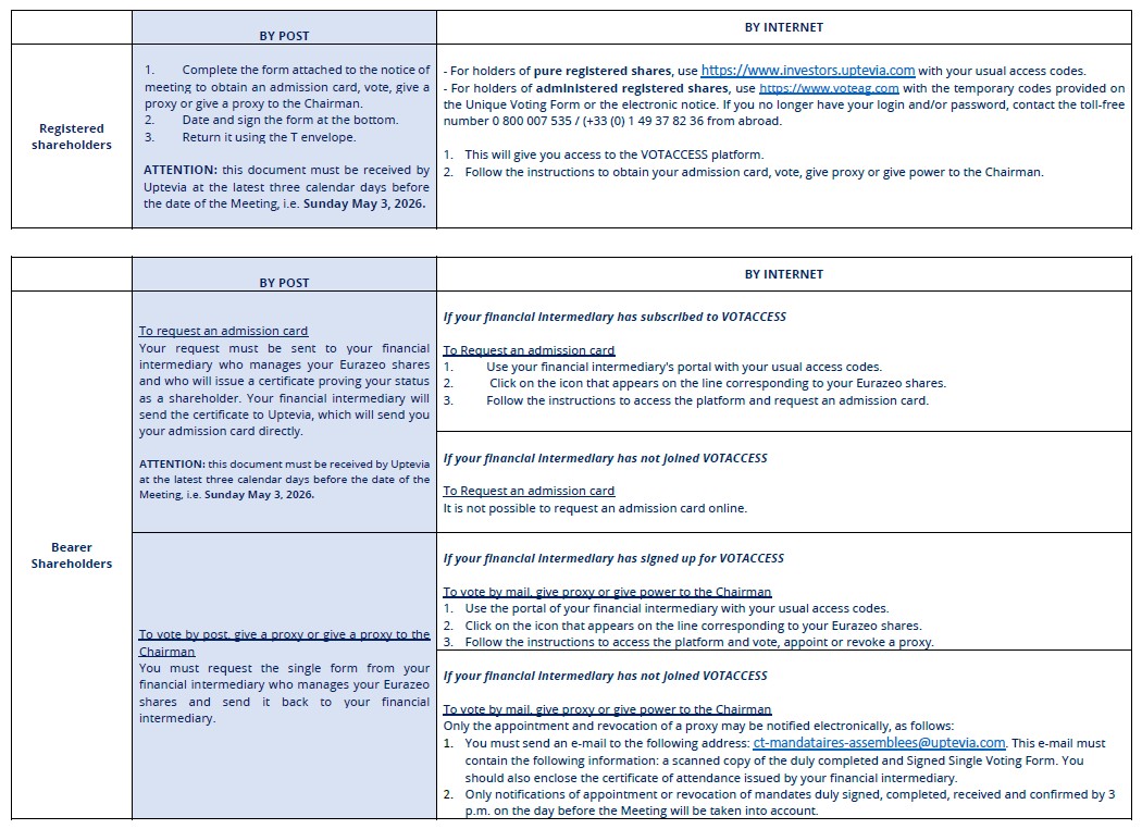 The VOTACCESS website will be open from Friday April 17, 2026 to carry out the various procedures described in the table below. Voting by Internet before the General Meeting via VOTACCESS will be possible until the day before and until 3 p.m., i.e. Tuesday May 5, 2026. For security reasons, it is better not to wait until the last moment.