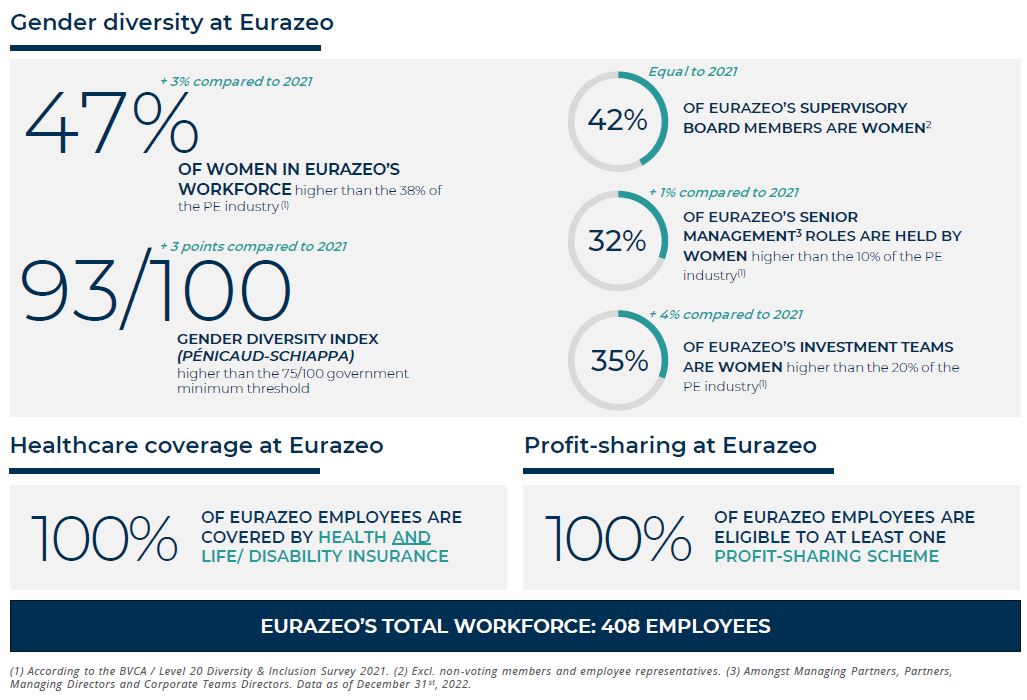 - Participation to the activities of France Invest, to its Talents & Diversity Commission, and recognition of Eurazeo’s actions through a reward: the High Prize for being the “GP company that leads the most active policy in terms of feminization actions in its Investment Teams” in 2022.