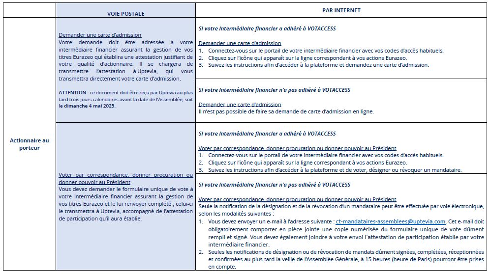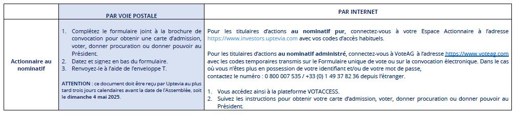 Pour réaliser les différentes démarches décrites dans le tableau ci-dessous, le site VOTACCESS sera ouvert à compter du vendredi 18 avril 2025. Le vote par Internet avant l’Assemblée Générale via VOTACCESS sera possible jusqu’au jour précédent et jusqu’à 15 heures, soit le mardi 6 mai 2025. Par sécurité, mieux vaut toutefois ne pas attendre le dernier moment.